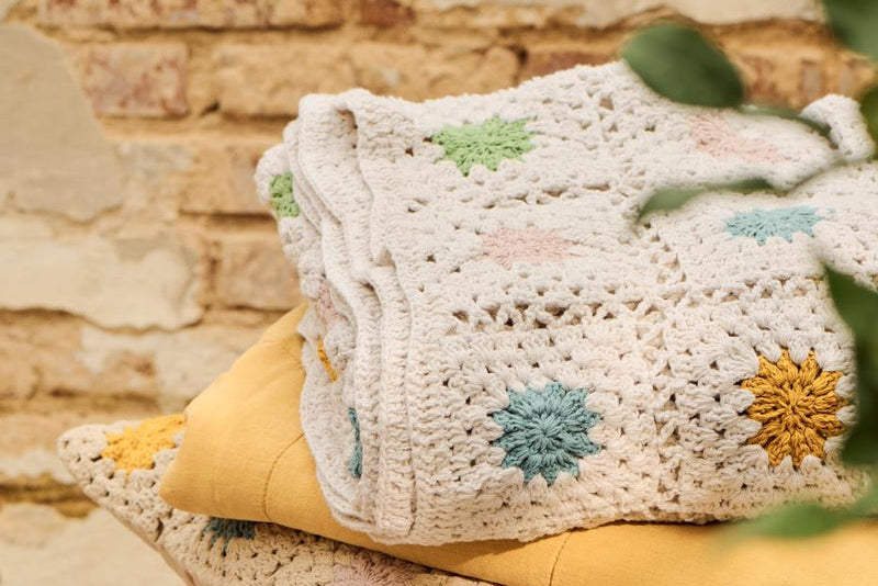 Heklet Pledd, Kremfarget m/ Blomster