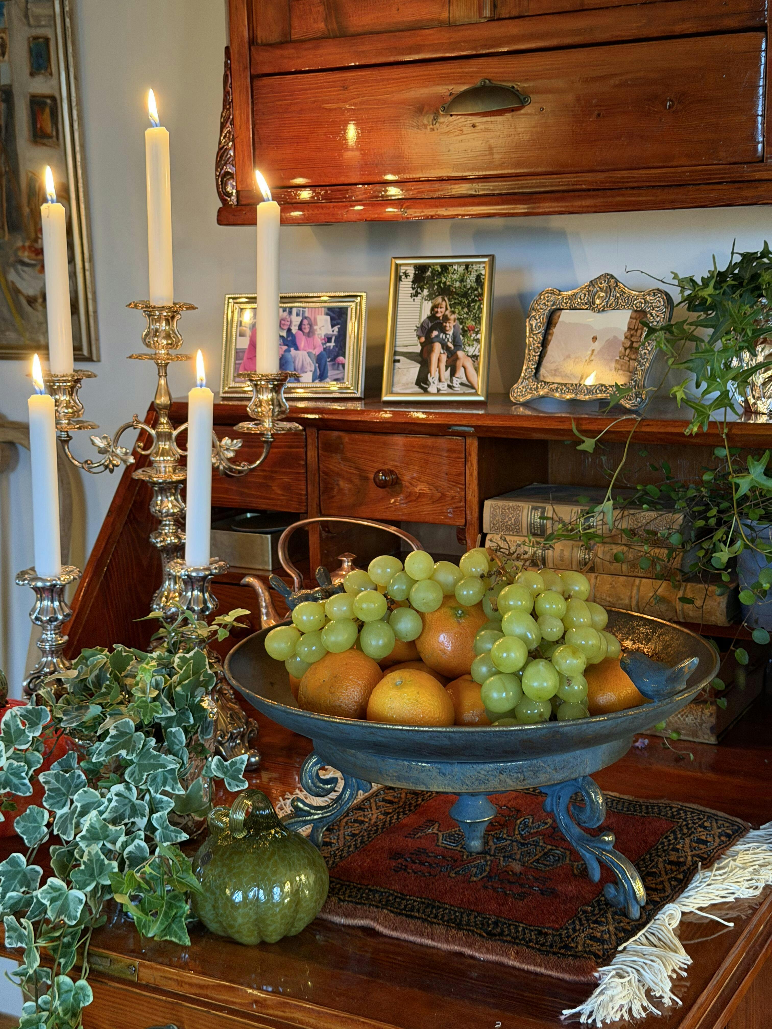 Stor og vakker skål (fuglebad) med ben som har en rustikk patina. Dekorert med tre fugler.